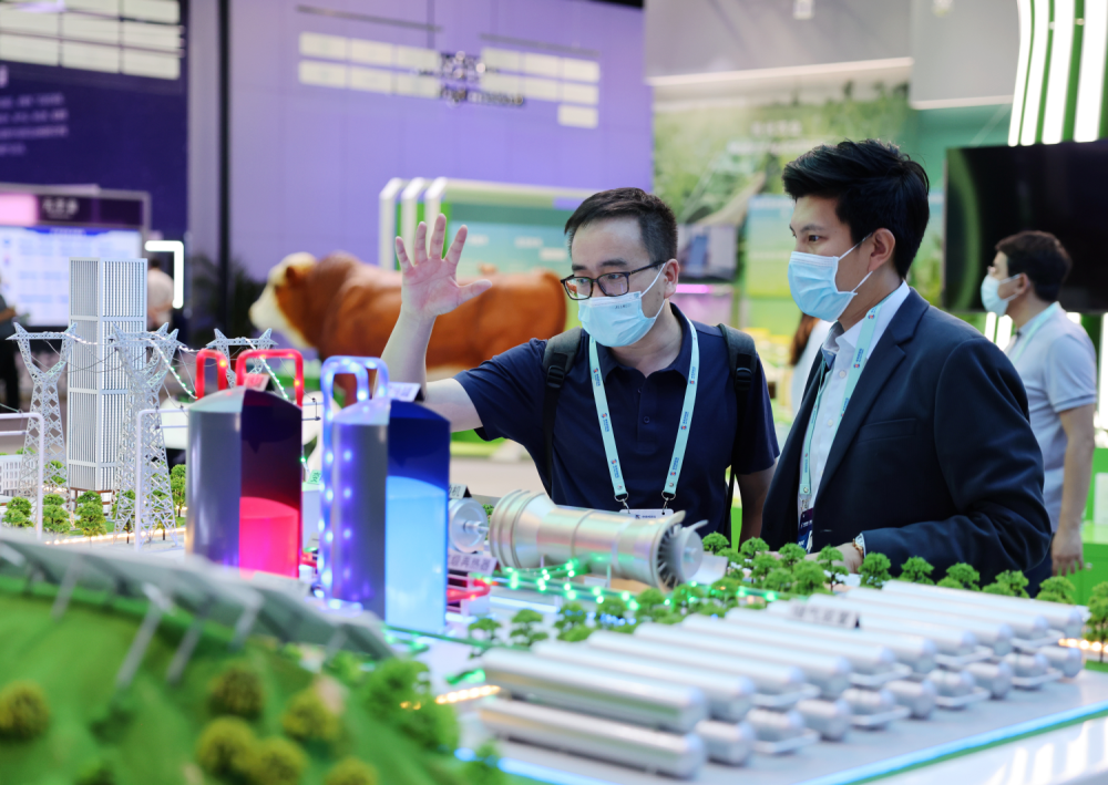 5月26日,觀眾在中關(guān)村國(guó)家自主創(chuàng)新示范區(qū)展示中心了解100MW先進(jìn)壓縮空氣儲(chǔ)能技術(shù)。新華社記者 張晨霖 攝
