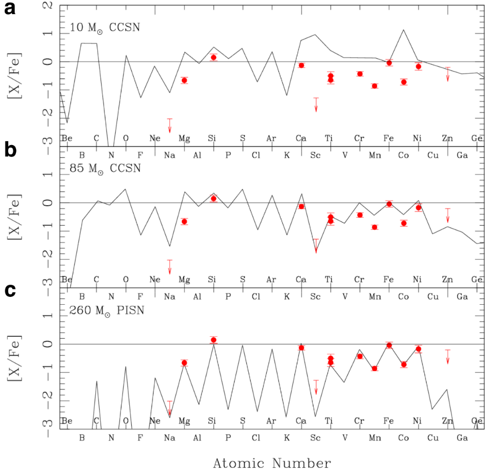 此項研究中,團隊結合郭守敬望遠鏡低分辨率光譜和日本昴星團望遠鏡高分辨率光譜數據發現了一顆化學豐度極為特殊的極貧金屬星(LAMOST J1010+2358),這顆恒星的化學豐度特征無法通過核坍縮超新星理論模型解釋,卻與260倍太陽質量的對不穩定超新星理論計算結果高度吻合。