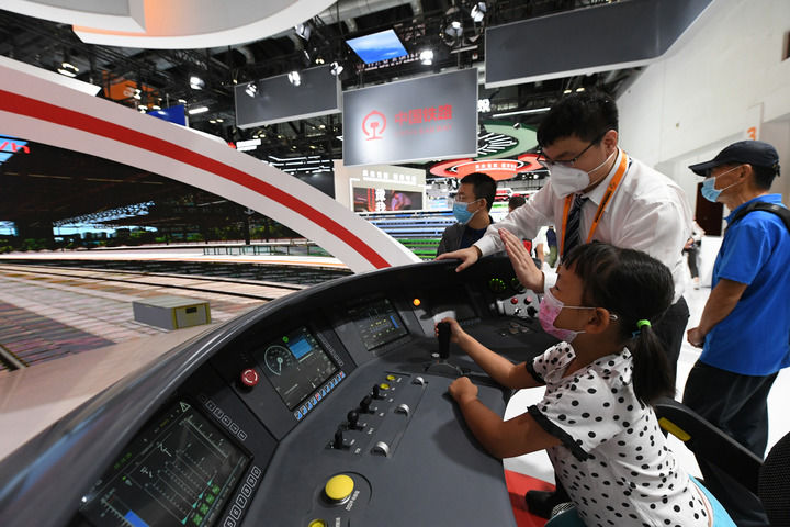 小朋友在2022年中國國際服務(wù)貿(mào)易交易會國家會議中心展館體驗京張高鐵動車組模擬駕駛臺(2022年9月3日攝)。新華社記者 任超 攝