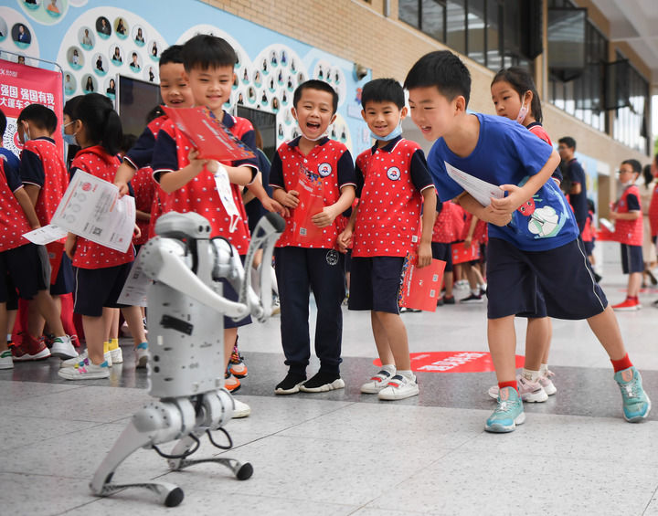 在湖南長沙華夏實驗學(xué)校舉辦“科技大篷車”進校園活動上,學(xué)生們在和機器狗互動(2022年6月22日攝)。新華社記者 薛宇舸 攝