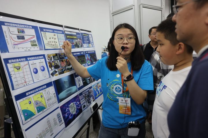 在中科院物理研究所超導(dǎo)國家重點實驗室,志愿者在向參觀者普及超導(dǎo)知識(2023年5月13日攝)。新華社記者 金立旺 攝