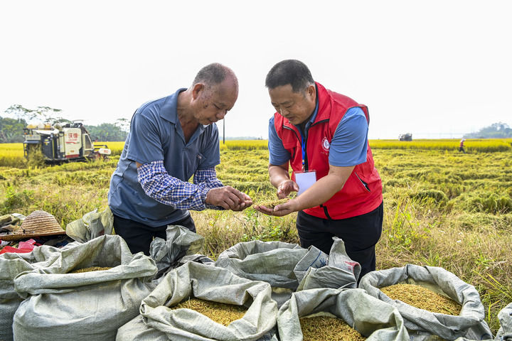 在廣西興業(yè)縣石南鎮(zhèn)鳳山村的稻田里,科技特派員(右)在查看晚稻品質(zhì)(2022年11月10日攝)。新華社記者 曹祎銘 攝