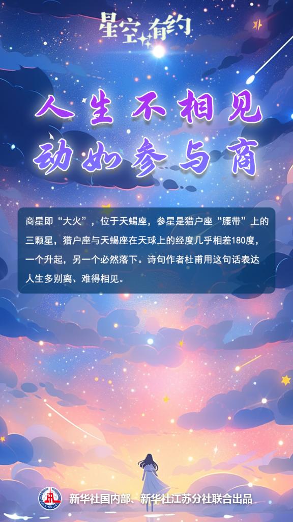 除了心宿二、“大火”、天蝎座α,這顆星還有別名“商星”。杜甫有詩云:“人生不相見,動(dòng)如參與商?!边@句話的意思是人生多別離、難得相見,好比此起彼落的參星與商星。王科超說,古人對星空的觀察細(xì)致入微。參星是獵戶座“腰帶”上的三顆星,它們與商星所屬的天蝎座在天球上的經(jīng)度幾乎相差180度,一個(gè)升起,另一個(gè)必然落下。