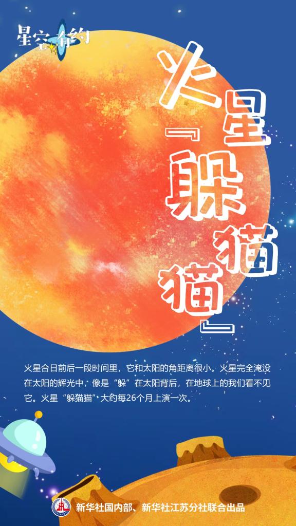 “具體來(lái)說(shuō),火星合日前后一段時(shí)間里,它和太陽(yáng)的角距離很小。火星像是‘躲’在太陽(yáng)背后,在地球上的我們看不見(jiàn)它。”王科超說(shuō),火星和地球每一輪會(huì)合周期中,都將迎來(lái)一次火星合日。二者平均會(huì)合周期約為780天,火星“躲貓貓”也大約每26個(gè)月上演一次。
