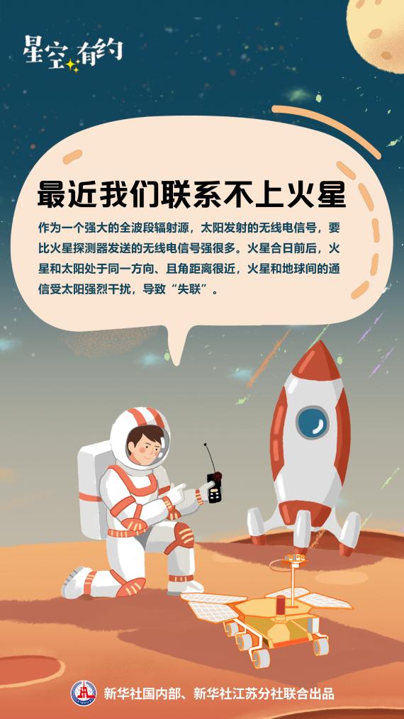 火星合日前后,我們不僅看不到火星,還將和它“失聯(lián)”一段時(shí)間。王科超解釋說(shuō),地球與火星上探測(cè)器的通信完全依靠無(wú)線電。作為一個(gè)強(qiáng)大的全波段輻射源,太陽(yáng)發(fā)射的無(wú)線電信號(hào),要比火星探測(cè)器發(fā)送的無(wú)線電信號(hào)強(qiáng)很多。火星合日前后,火星和太陽(yáng)處于同一方向且角距離很近,火星和地球間的通信受太陽(yáng)強(qiáng)烈干擾,導(dǎo)致“失聯(lián)”。不過(guò)不用擔(dān)心,“失聯(lián)”期不會(huì)很長(zhǎng),持續(xù)時(shí)間約為火星合日前后的幾周。