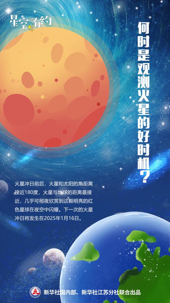 “火星沖日前后,火星和太陽(yáng)的角距離接近180度,火星與地球的距離最接近,幾乎可徹夜欣賞到這顆明亮的紅色星球在夜空中閃耀。”王科超說(shuō),下一次的火星沖日將發(fā)生在2025年1月16日。
