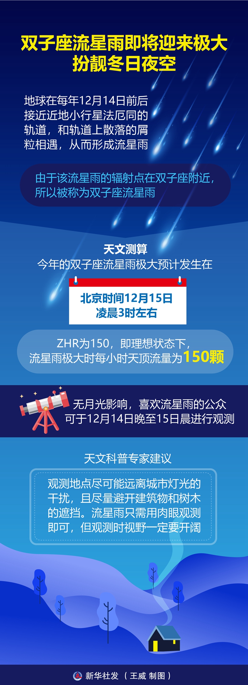 12月中旬,天黑后不久雙子座就從東方偏北的地平線上升起。“今年的雙子座流星雨不會受到月光影響,觀測條件極佳,喜歡流星雨的發燒友14日晚即可守著夜空,有較大的機會看到流星;有毅力的可以堅持到15日凌晨,屆時看到的流星數量會更多。”修立鵬說。