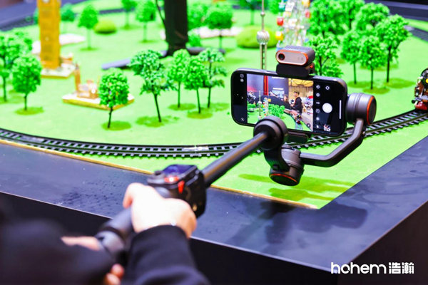 在hohem浩瀚展位,通过物体追踪区小火车的场景化展示,现场观众直观感受到了浩瀚M7的“万物AI跟拍”功能。无论是舞台表演、新品发布,还是现场互动,浩瀚M7展现了炫酷的运镜和稳定流畅的画面,为观众带来了独特的观展视觉体验。