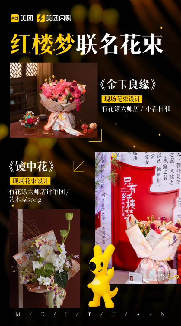 结合母亲节与情人节礼赠场景,美团闪购鲜花推出只有红楼梦·戏剧幻城联名花束,花束在产品整体打造上聚焦红楼梦经典色调“软烟罗”色系,打造红楼特色的新中式花束,同时也将只有红楼梦·戏剧幻城景区推广向了更多用户。