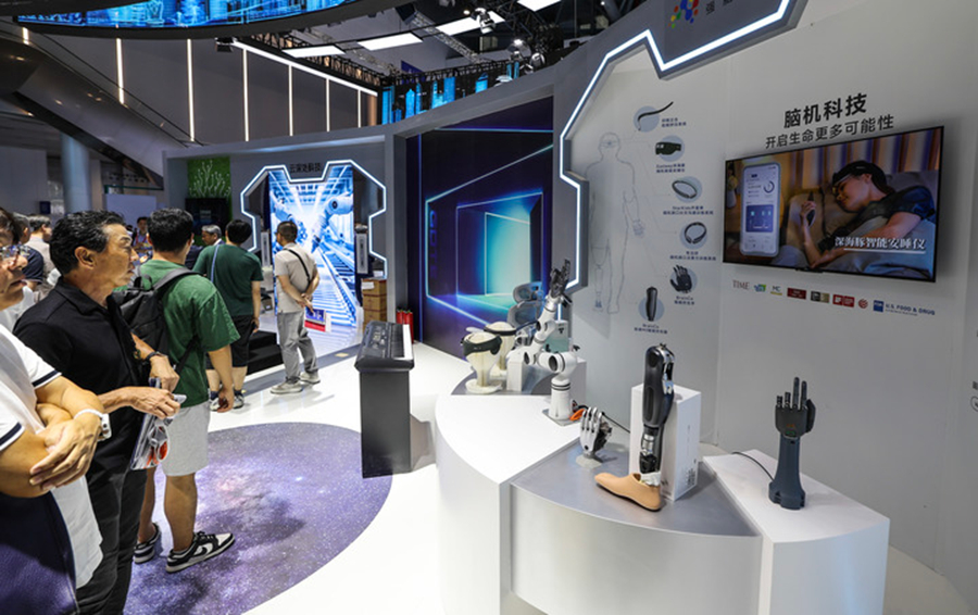 2025年9月25日,在第四届全球数字贸易博览会的数智未来主题展区的杭州六小龙专区,观众在观看强脑科技的智能仿生手。新华社记者 徐昱 摄