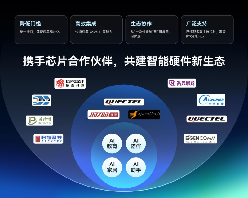 今年年初,声网宣布了一项具有行业战略意义的举措:将核心的硬件抽象层项目AOSL在GitHub全面开源。AOSL在操作系统、芯片与RTC传输层之间定义了一套标准接口,屏蔽了底层FreeRTOS、Linux与不同芯片型号之间的差异。对于芯片厂商而言,接入AOSL意味着其硬件从出厂即具备了“声网级”的实时互动能力。