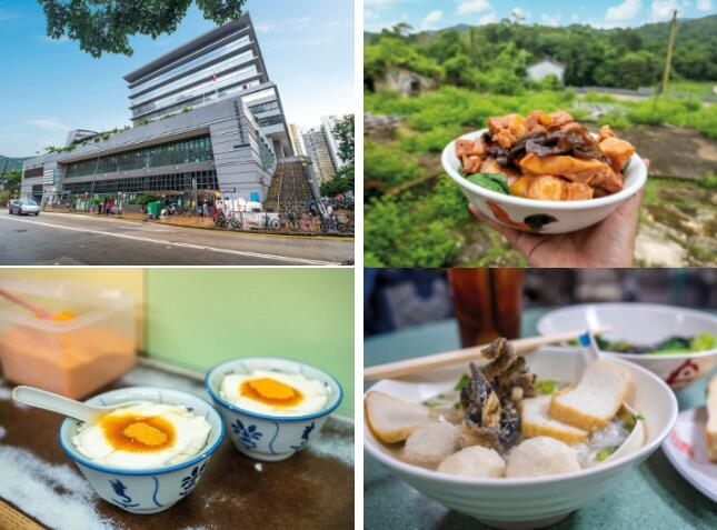 大埔墟街市(左一),客家红烧猪肉(右一),豆腐花(左二),鱼蛋粉(右二)(图片来源:香港旅游发展局)