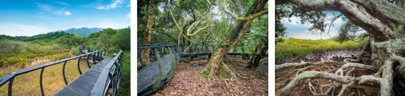 荔枝窝自然步道(左),步道两旁攀援的古木(中),纵横交错的红树林(右)(图片来源:香港旅游发展局)