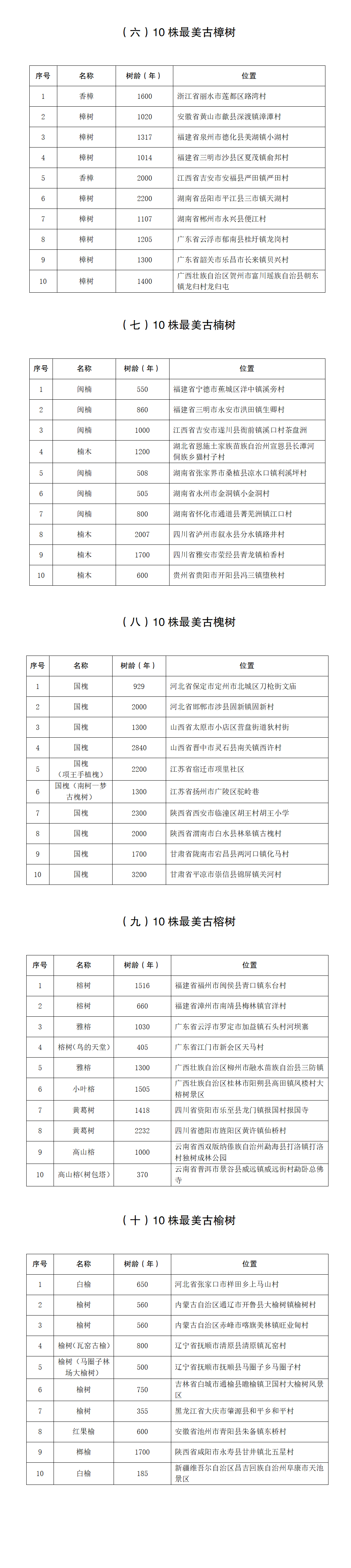 经过公众投票、专家评审、全网公示等环节,从全国各地推选出黄帝手植柏、黄山迎客松、北京潭柘寺帝王树等100株最美古树和蜀道翠云廊古柏群、林芝巨柏古树群、利川古水杉群等100个最美古树群。