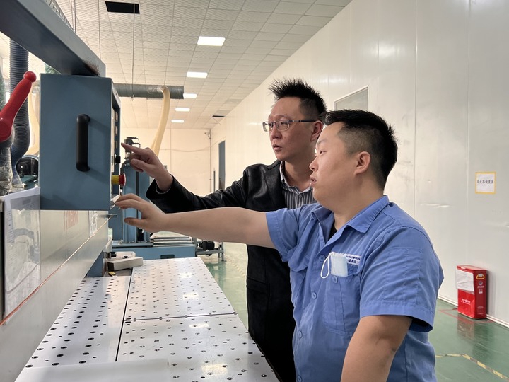 圖為咸陽卓英社光電科技有限公司總經理林資程(后)和公司員工在操作機器(5月13日攝)。新華社記者蔡馨逸 攝