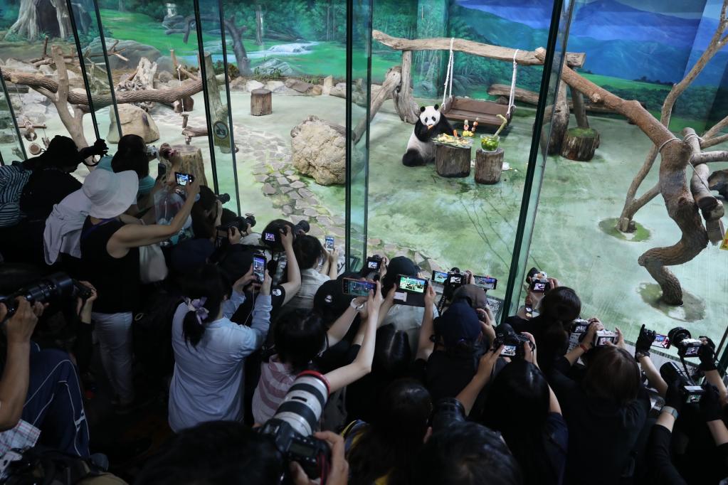 2020年7月6日,參觀者在臺北市立動物園拍攝大熊貓“圓仔”。當日,臺北市立動物園為大陸贈臺大熊貓“團團”“圓圓”的孩子“圓仔”慶祝7周歲生日。新華社記者 祁星 攝