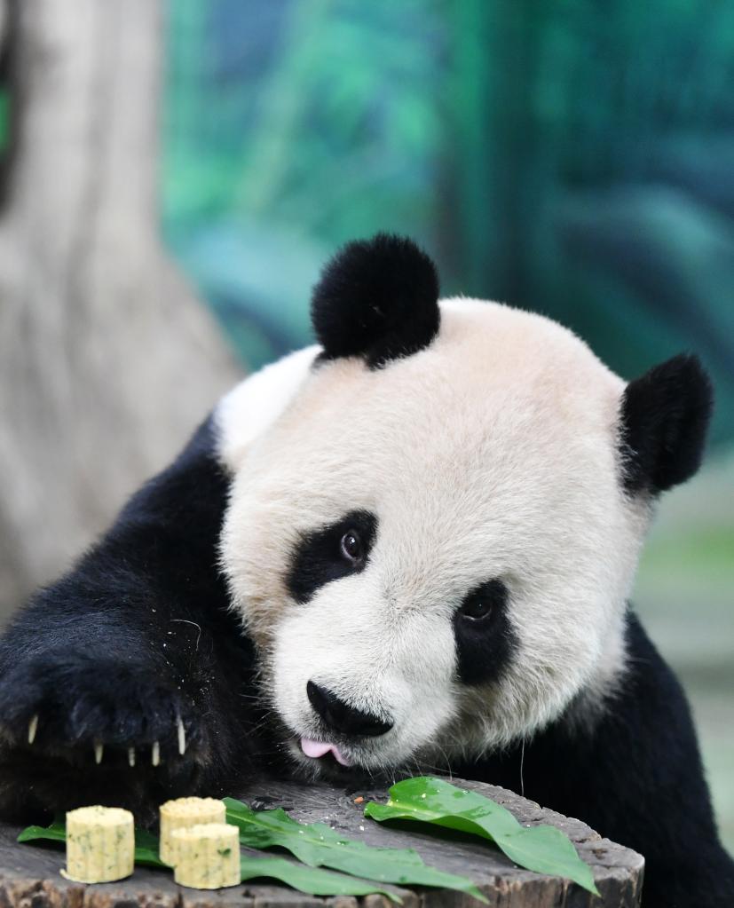 2019年9月13日,臺北動物園大熊貓“團團”在品嘗特制月餅。當日,臺北動物園熊貓館的飼養員特制月餅和果蔬串等食物,讓大熊貓和人們一起歡度中秋。新華社記者 陳斌 攝