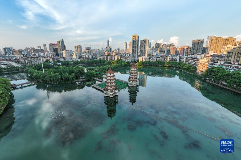 7月3日拍攝的武漢市寶島公園湖心島上的“龍虎塔”(無人機照片)。新華社記者 伍志尊 攝