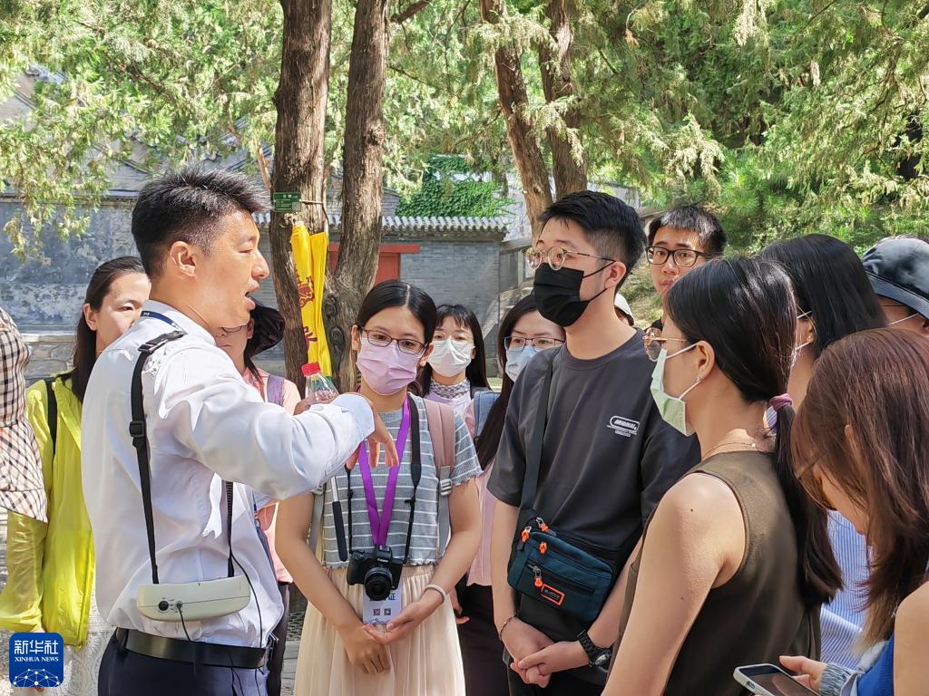 參加臺胞青年夏令營的青年在北京市頤和園內聆聽講解員講解(7月7日攝)。 新華社記者 趙歡 攝