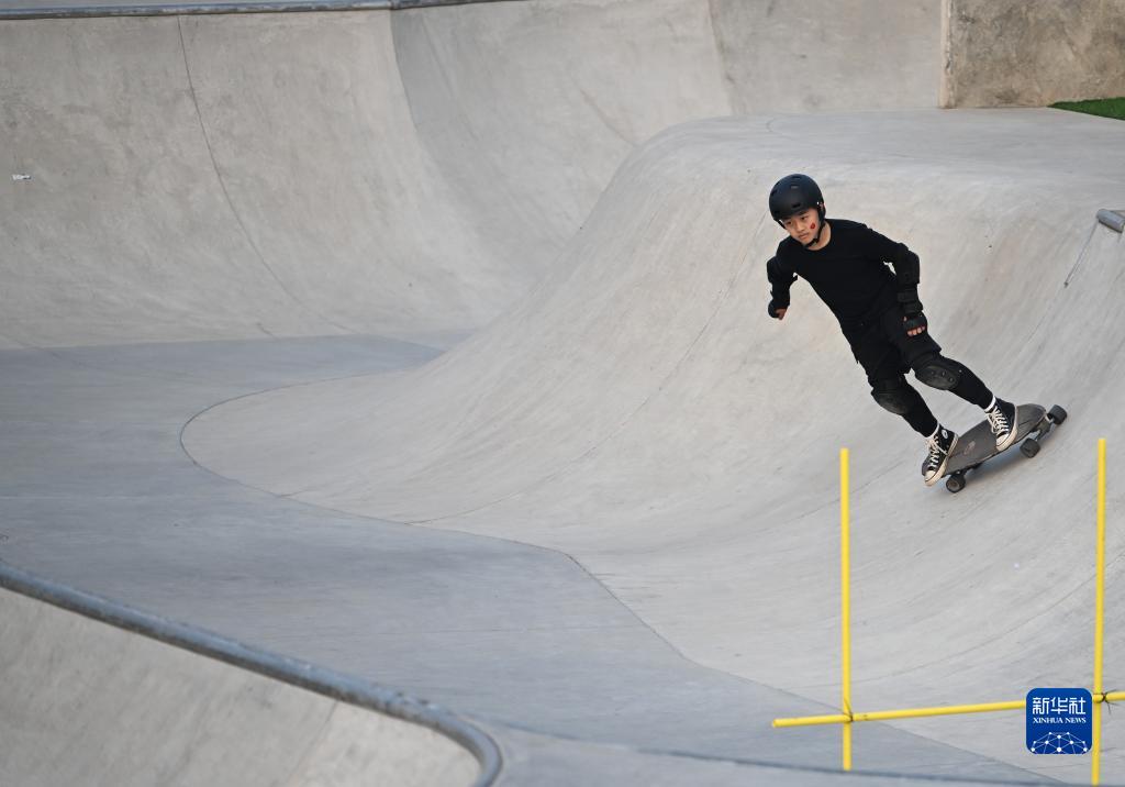 戴瑋萱在天津市西青區一處滑板公園的泵道上滑行(10月28日攝)。新華社記者 孫凡越 攝
