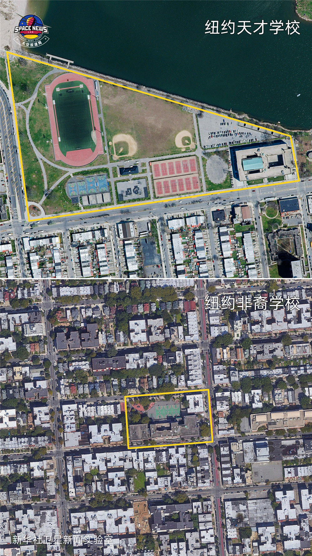 在紐約,以“天才”為名、白人學生過半的學校,擁有12座網球場、一座棒球場、若干籃球場和一座大型運動場;而在非裔學生占比91.1%的另一所學校,衛星只發現了3個籃球場。