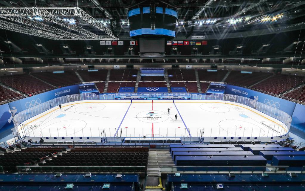 14日,北京冬奧會(huì)冰球場館五棵松體育中心完成冰球標(biāo)志、標(biāo)線和冬奧會(huì)LOGO鋪設(shè)。此后,制冰工作進(jìn)入冰層加厚階段。