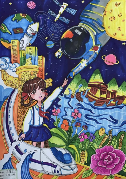 图为来自甘肃的高梓宁创作的绘画作品《航天之梦,繁花颂华》。