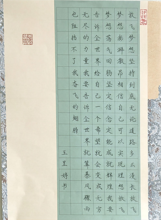 图为来自河北的康卓伊创作的书法作品《逐梦青春》。