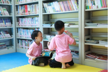 孩子们在“阳光驿站”的阅读角选书、看书