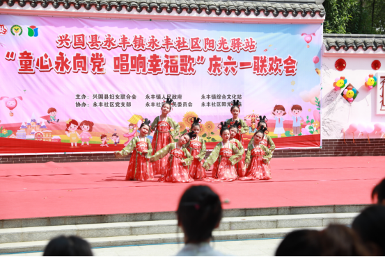 5月26日,在江西省赣州市兴国县永丰镇永丰社区阳光驿站举办的六一联欢会活动现场,身着汉服的小朋友们在表演歌舞节目。新华网李科燊 摄