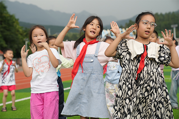 7月28日,贵州省盘州市沙陀小学的学生们在操场上跳舞。新华网章佳礼 摄