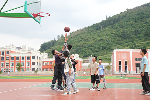 7月28日,贵州省盘州市沙陀小学的篮球场上,孩子们正在打篮球。新华网章佳礼 摄