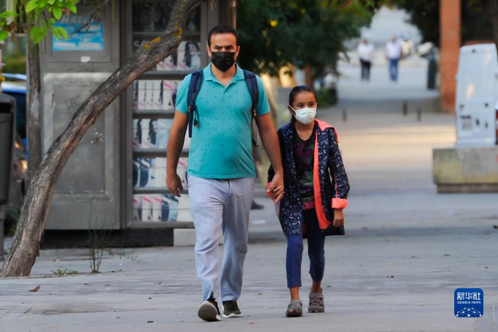 9月8日,一名家長在西班牙馬德里送孩子上學。