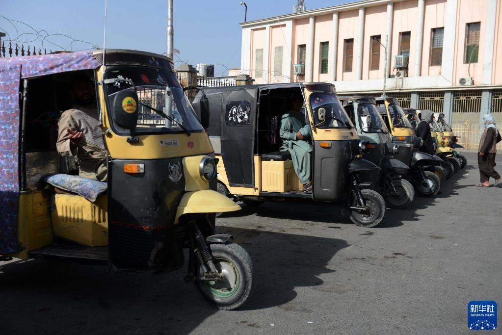 9月14日,三輪車司機在阿富汗坎大哈街頭等待顧客。