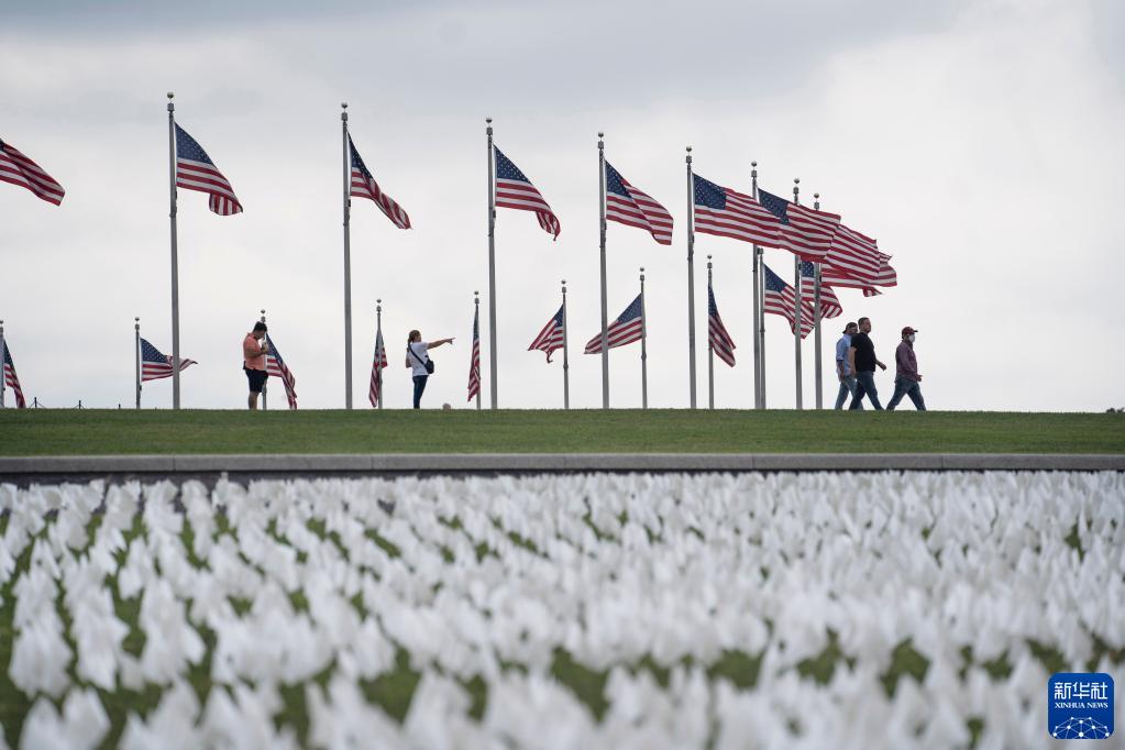 9月16日,在美國首都華盛頓,白色旗幟擺放在草坪上悼念新冠逝者。