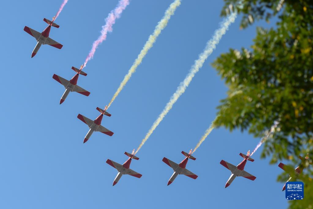 10月12日,空軍飛機在西班牙首都馬德里的國慶日慶祝活動上接受檢閱。