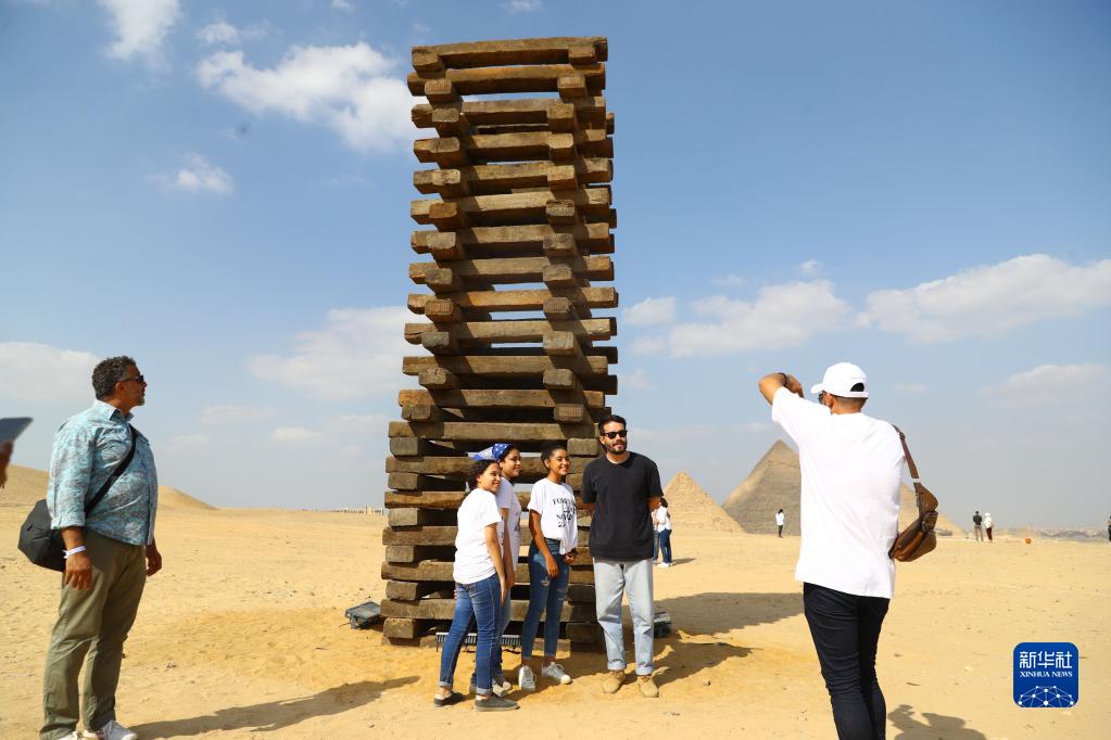 10月21日,在埃及吉薩金字塔景區(qū)舉辦的藝術(shù)展上,游客在一件藝術(shù)作品前留影。