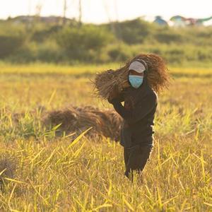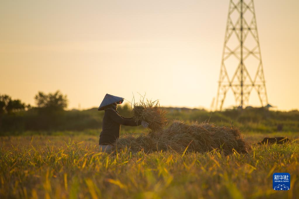 10月25日,農(nóng)民在老撾萬象城邊的田地里收割稻谷。