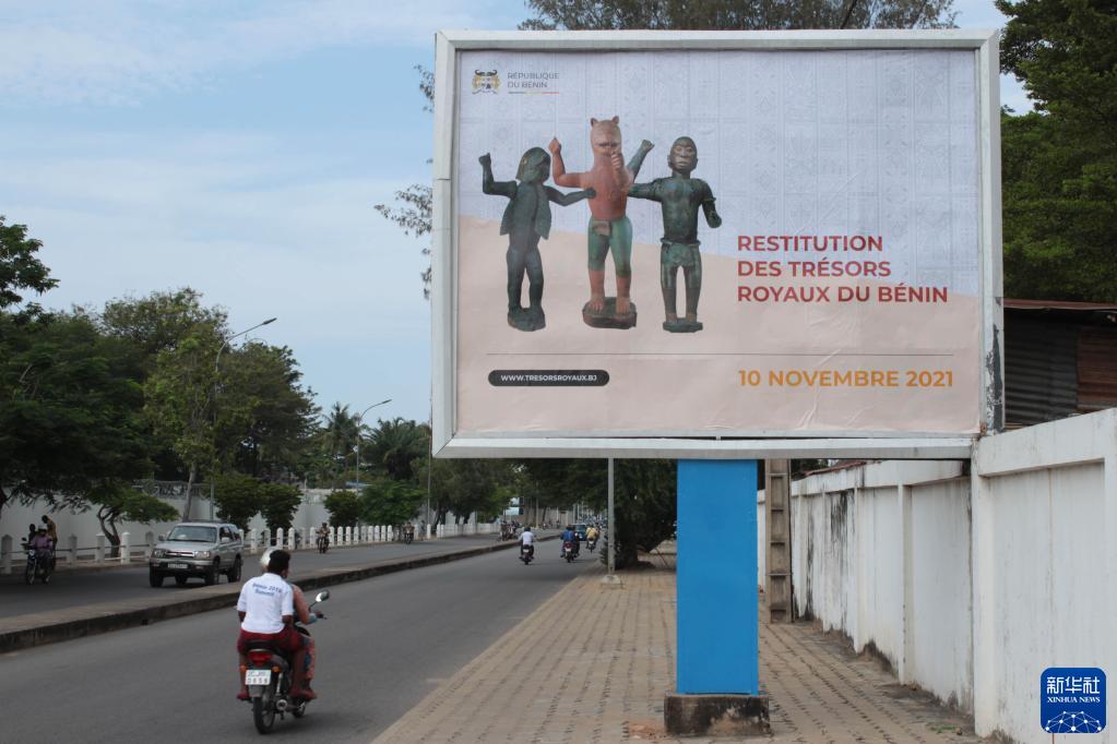 這是11月10日在貝寧科托努街頭拍攝的慶祝文物回歸的海報。