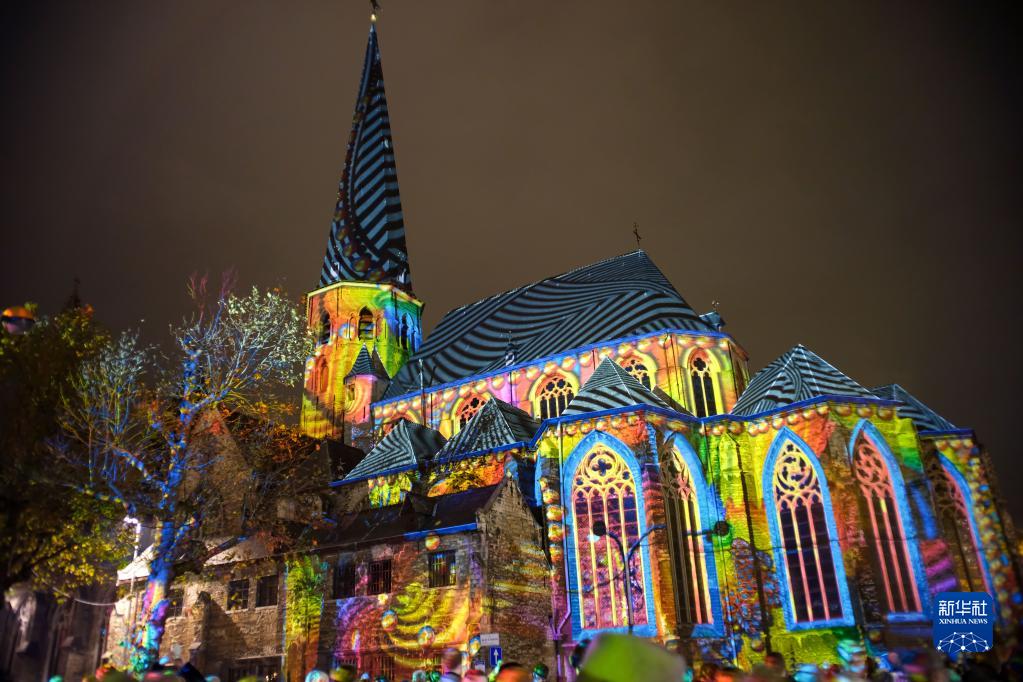 這是11月11日在比利時根特燈光節上拍攝的燈光藝術作品。