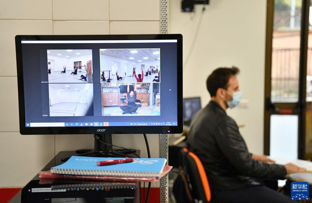 11月16日,在意大利羅馬國家舞蹈學院,電腦屏幕顯示學生通過線上線下相結合的方式參加現代舞課程。
