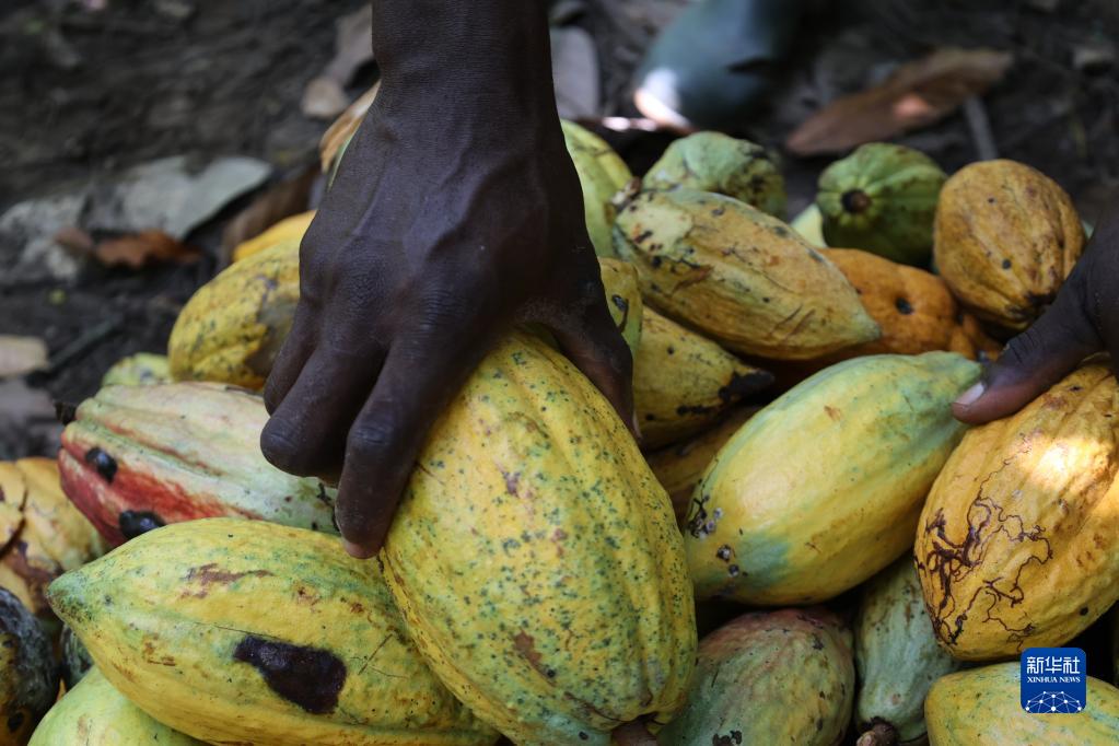 11月15日,在加納東部省的一處可可種植園,一名種植戶在整理可可果實。