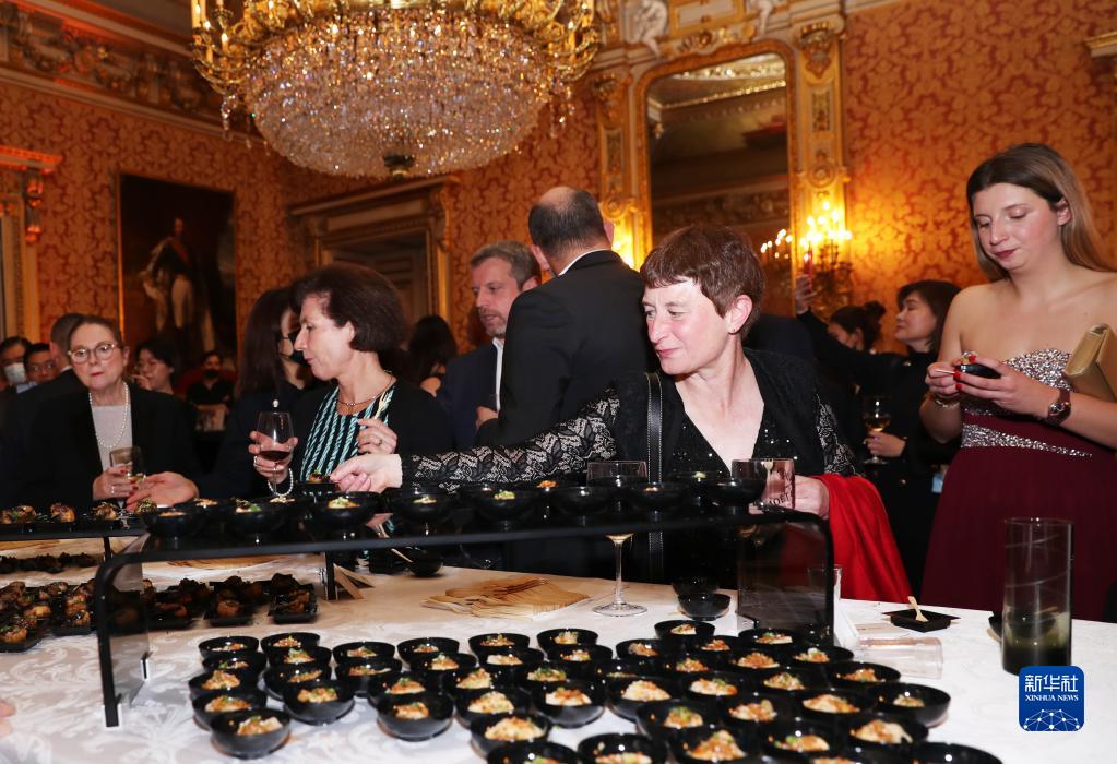 11月29日,在位于巴黎的法國外交部舉行的LA LISTE國際美食榜單揭曉活動現(xiàn)場,來賓在巴黎中餐館“幸福樓”的攤位前品嘗美食。