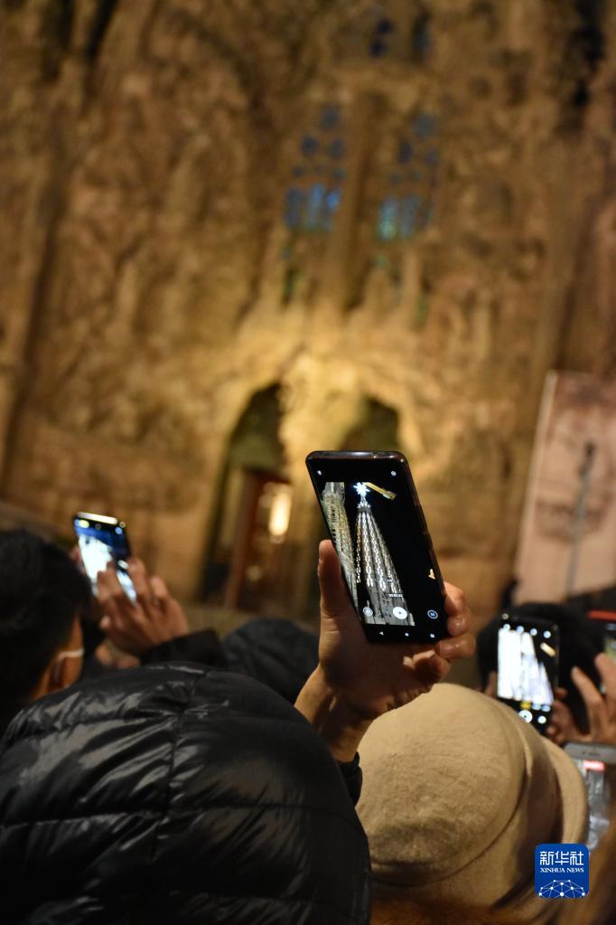 12月8日,人們在西班牙巴塞羅那拍攝圣家堂塔頂之星。