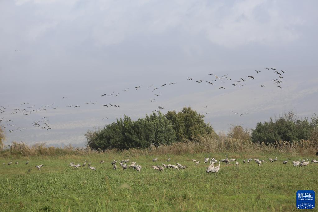 12月9日,一群灰鶴在以色列阿格蒙胡拉鳥類和自然公園的濕地里休息。