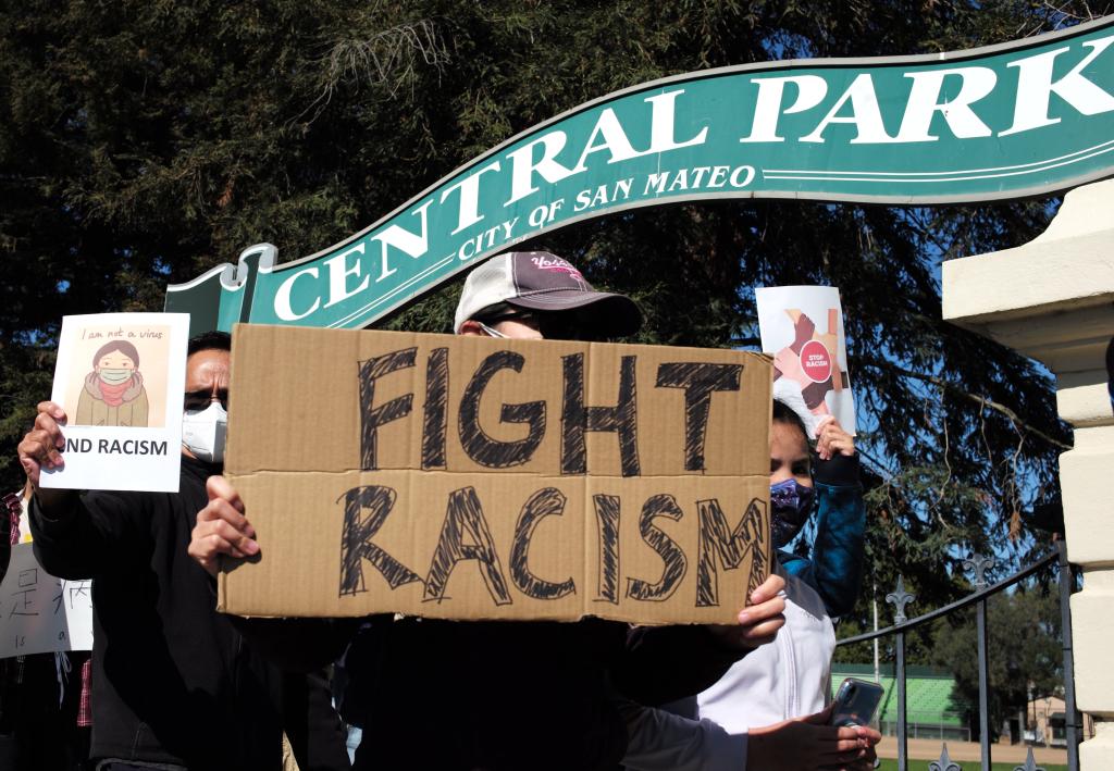 2月27日,在美國加利福尼亞州舊金山灣區圣馬特奧市,人們參加集會反對針對亞裔的歧視行為和仇恨犯罪。(新華社記者吳曉凌攝)