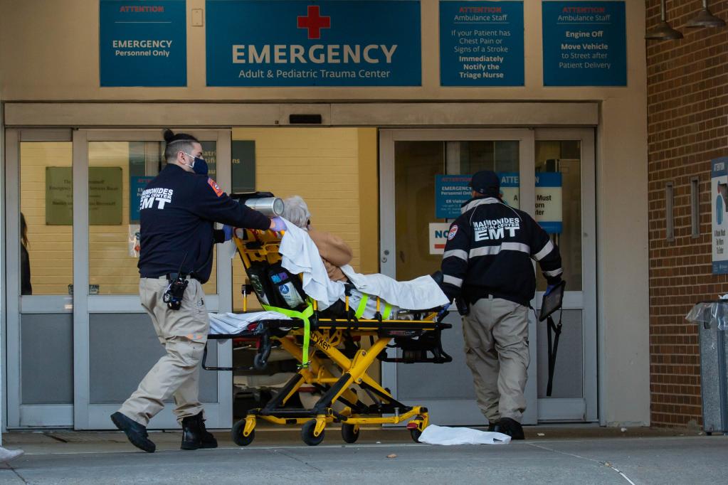 12月14日,在美國紐約,工作人員將一名病人送入醫(yī)院。美國約翰斯·霍普金斯大學12月28日發(fā)布的統(tǒng)計數(shù)據(jù)顯示,美國累計新冠確診病例逾5279萬例,累計死亡病例逾81.8萬例。(新華社發(fā),郭克攝)
