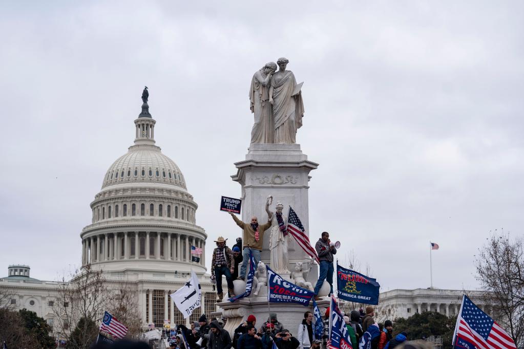 1月6日,在美國首都華盛頓,時任總統(tǒng)特朗普的支持者舉行示威游行,要求推翻2020年總統(tǒng)選舉結(jié)果。部分示威者沖入國會大廈,導致參眾兩院認證拜登當選總統(tǒng)的聯(lián)席會議被迫中斷。騷亂造成5人死亡。(新華社記者劉杰攝)