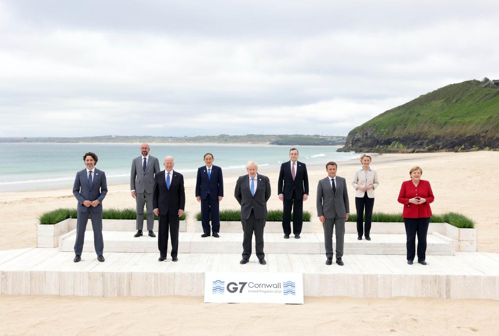 6月11日,參加七國集團峰會的領導人在英國康沃爾郡卡比斯貝合影。(新華社發(fā),英國首相府供圖)