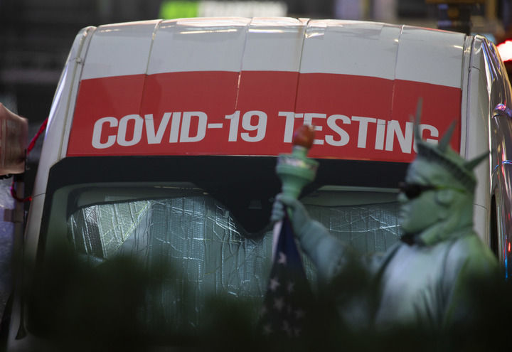 12月20日,一名街頭演員在美國(guó)紐約時(shí)報(bào)廣場(chǎng)一處臨時(shí)核酸檢測(cè)點(diǎn)旁表演。新華社記者王迎攝
